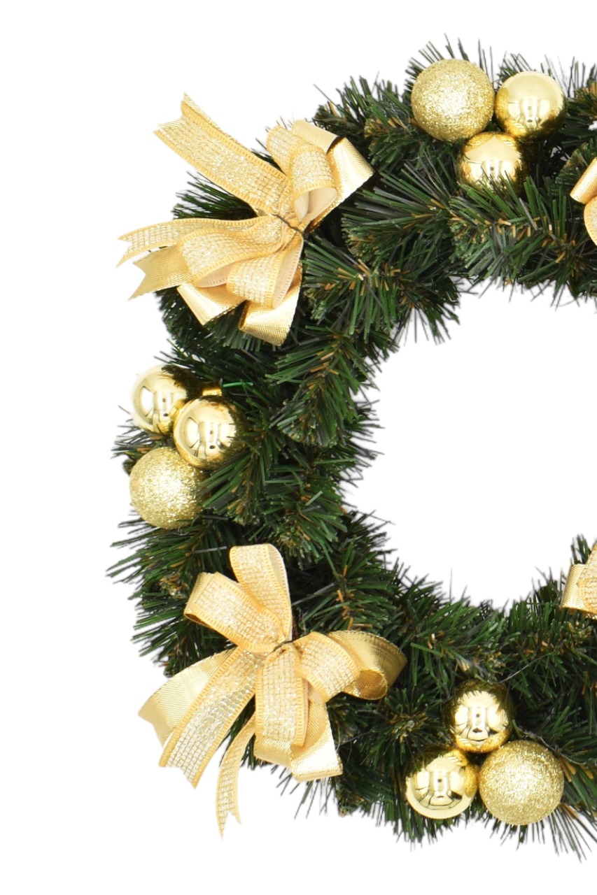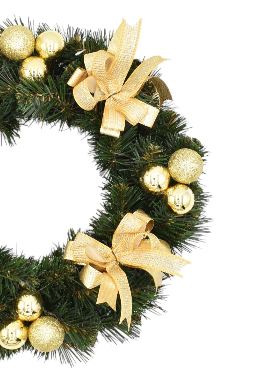Exkluzivní dekorační adventní věnec přivede vaši vánoční výzdobu do dokonalosti. Tento vánoční věnec má husté, kvalitně zpracované PVC jehličí zelené barvy, které je doplněno vkusnými ozdobami ve zlaté barvě a zlatými mašlemi.
