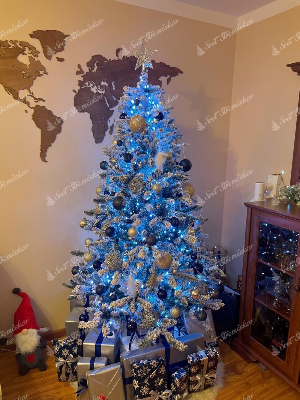 Na stromku je zabudované LED osvětlení teplé bílé barvy. Díky tomu již více nemusíte ztrácet čas nekonečným věšením osvětlení na stromeček. Počet LED světélek záleží na velikosti stromku.