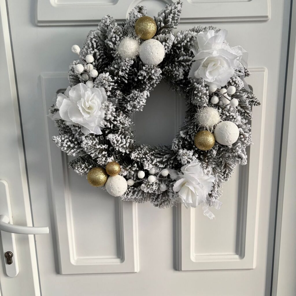 Věnec ma průměr 50cm a dodává se již v rozloženém stavu. Tento bílý vánoční věnec je vhodný jako dekorace na stůl, dveře a také může zkrášlovat vaši zeď či krb.