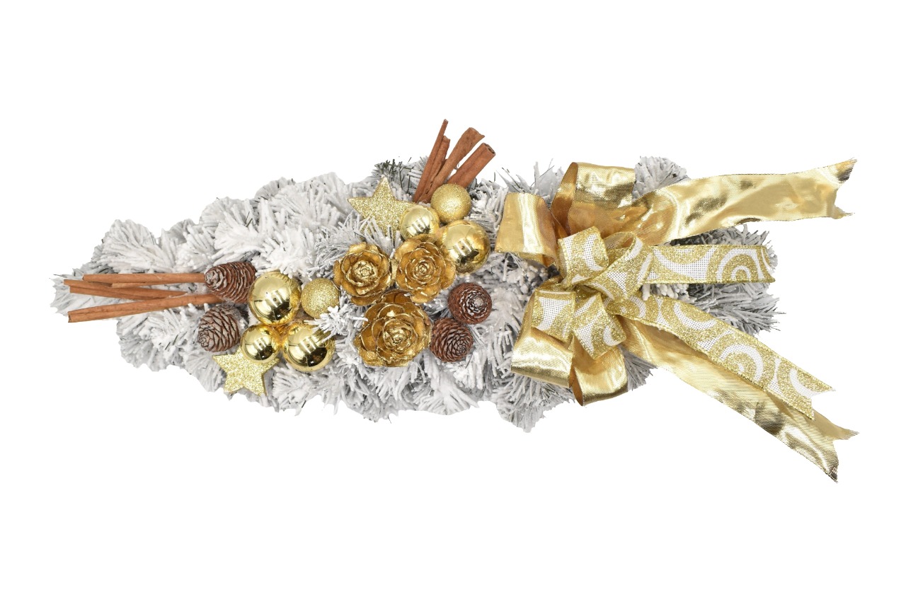 Středová girlanda na stůl je vkusně vyzdobená v luxusních zlatých odstínech. Dominují na ní vánoční koule a šišky ve zlaté barvě, skořice a mohutná zlatá mašle.