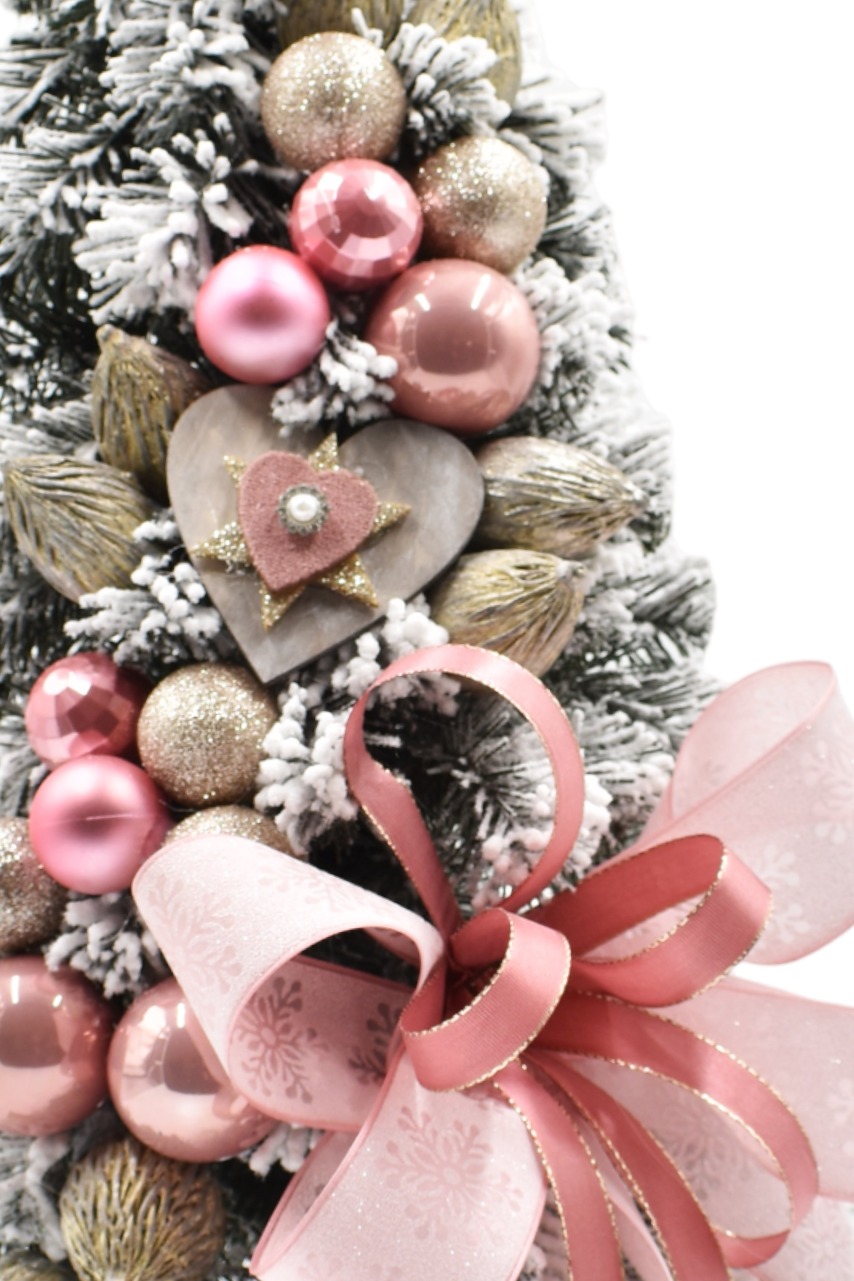 Zasněžený malý vánoční stromek Růžový je skvělou dekorací do vaší domácnosti. Tento malý, ozdobený vánoční stromeček vás zaujme svým zimním vzhledem, díky hustému nánosu umělého sněhu, rovnoměrným jehlanovým tvarům a vkusně laděnou výzdobou.