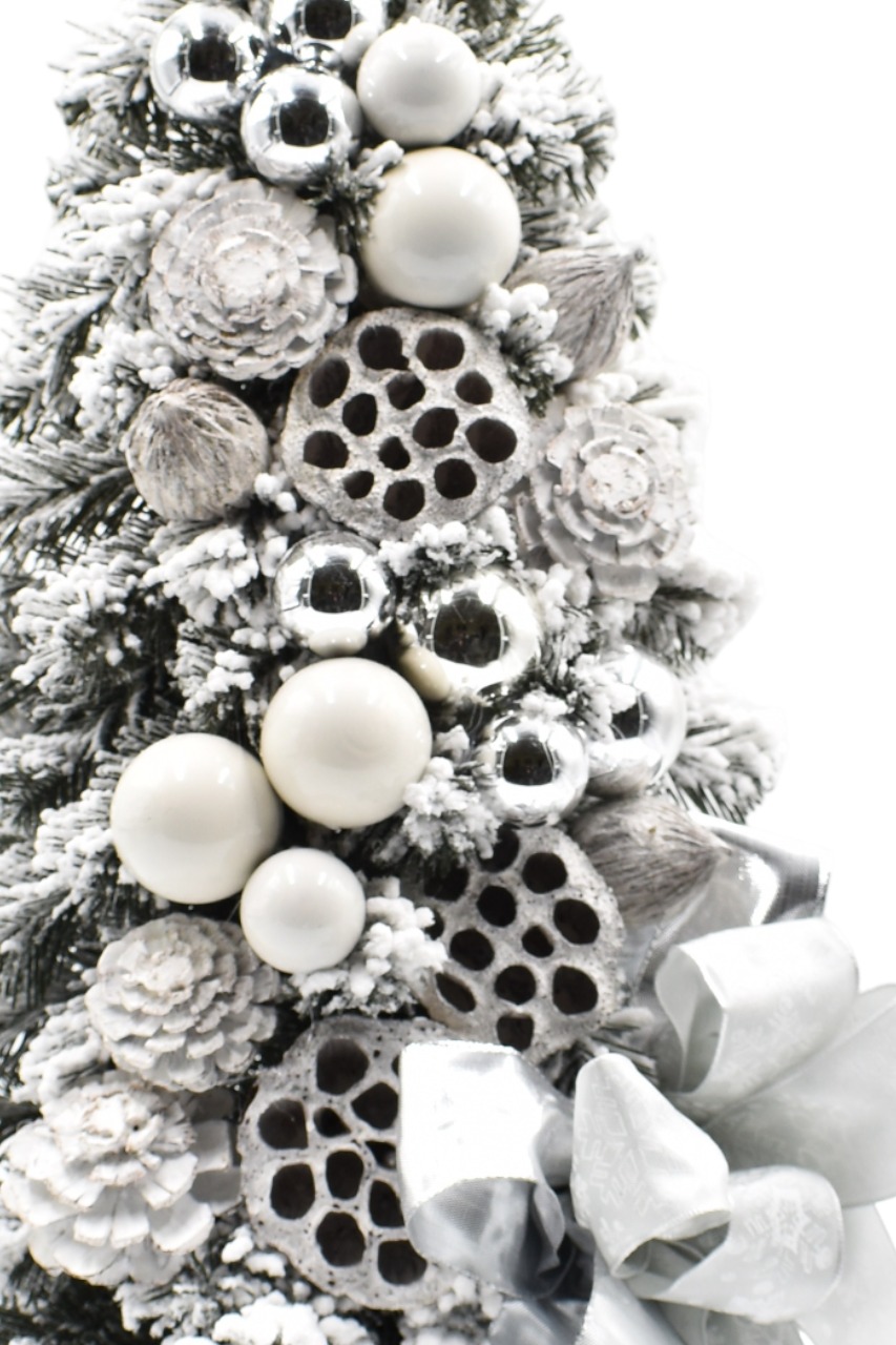 Zasněžený malý vánoční stromek stříbrno-bílý je skvělou dekorací do vaší domácnosti. Tento malý, ozdobený vánoční stromeček vás zaujme svým zimním vzhledem, díky hustému nánosu umělého sněhu, rovnoměrným jehlanovým tvarům a vkusně laděnou ledovou výzdobou.